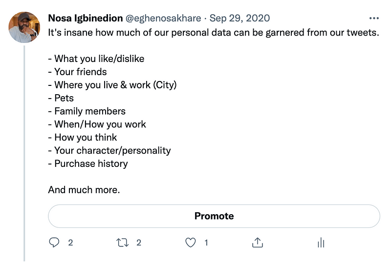 One of my followers claimed to not share a lot on Twitter, so I decided to visit her profile for a few minutes, and that’s what I found out. That was literally a few minutes. Now, I know it’s not much, and I think I got one thing wrong (Amaka is her sister/cousin and not a friend, or something like that) but if I wanted to sell something to her, I have information that’ll be conducive to the sale. I’m a human being, who had a few minutes to spare. Think of what tech can do.